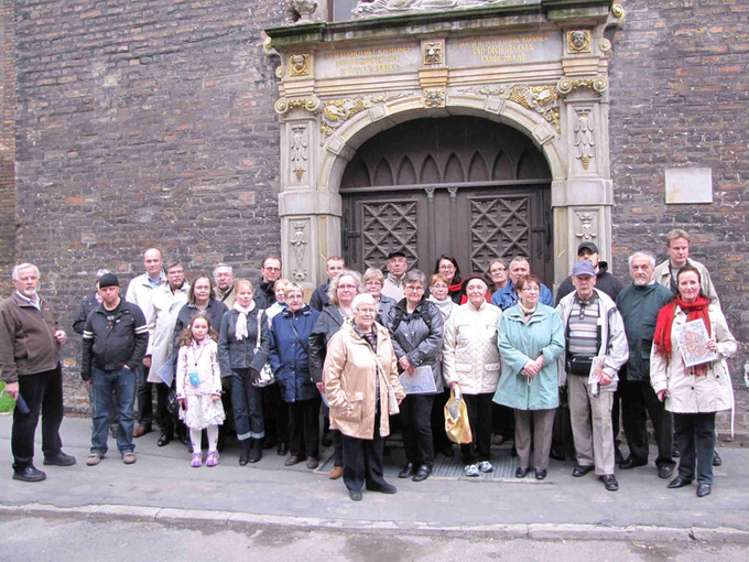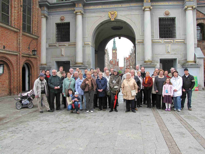 Sukumatkalaisia Danzigin Pyhän Bartoholomeuksen kirkon luona.